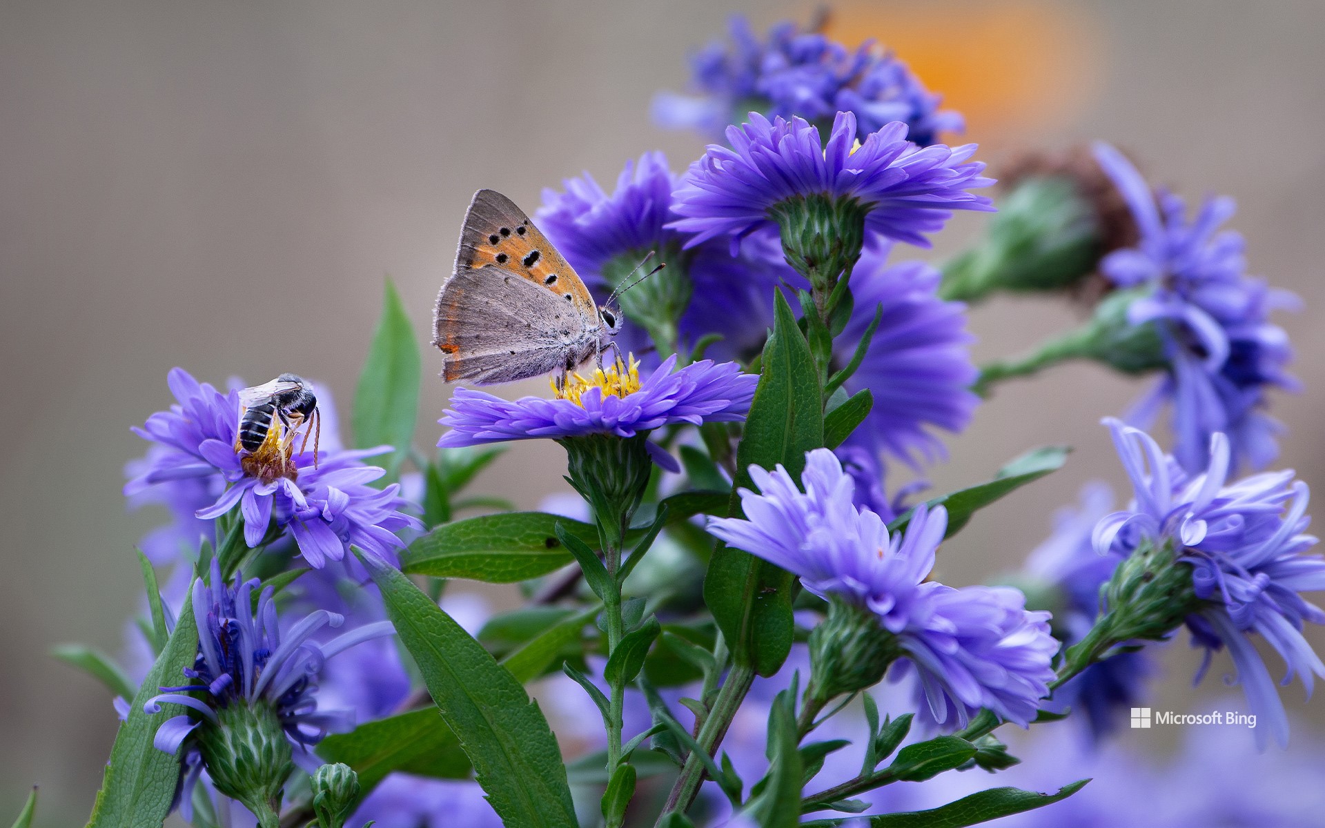 Papillon et abeille butinant délicatement une fleur aster (© Viviane Caballero/500px Viviane Caballero/500px/Getty Images)