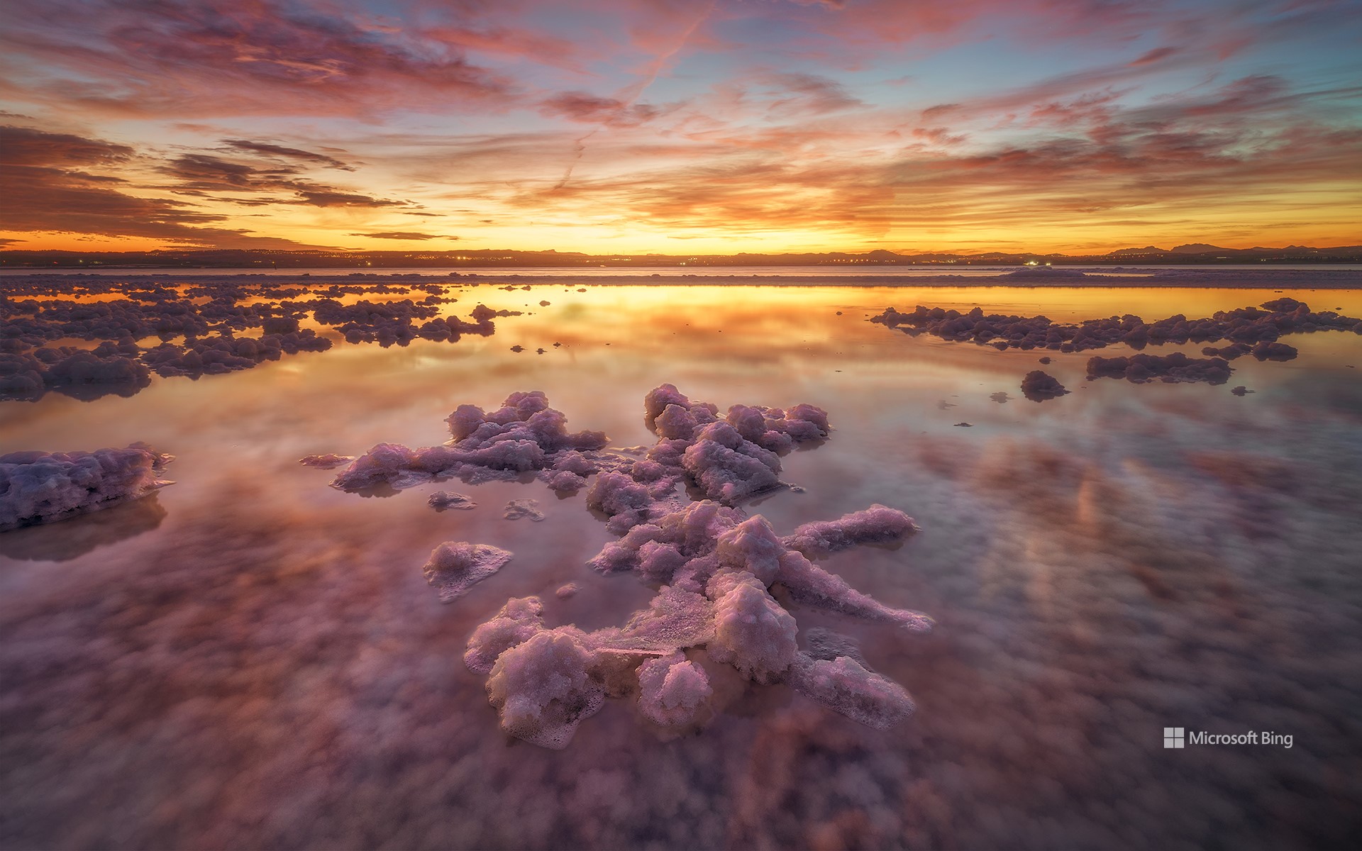 通常海や湖などを訪れると、人は自然に、浅瀬の淡い水色から深淵の濃い紺色への、青のグラデーションを期待しますが、ここスペインのアリカンテにあるサラダ・デ・トレビエハ湖の水は、幻想的なピンク色、予想を覆す驚きの光景が広がります。特にピンク色の湖に沈む夕日の景色は絶景です…