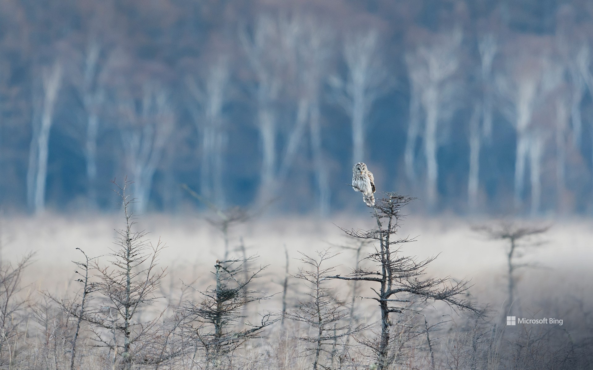 枝の先に止まっているフクロウ (© rockptarmigan/Getty Images)