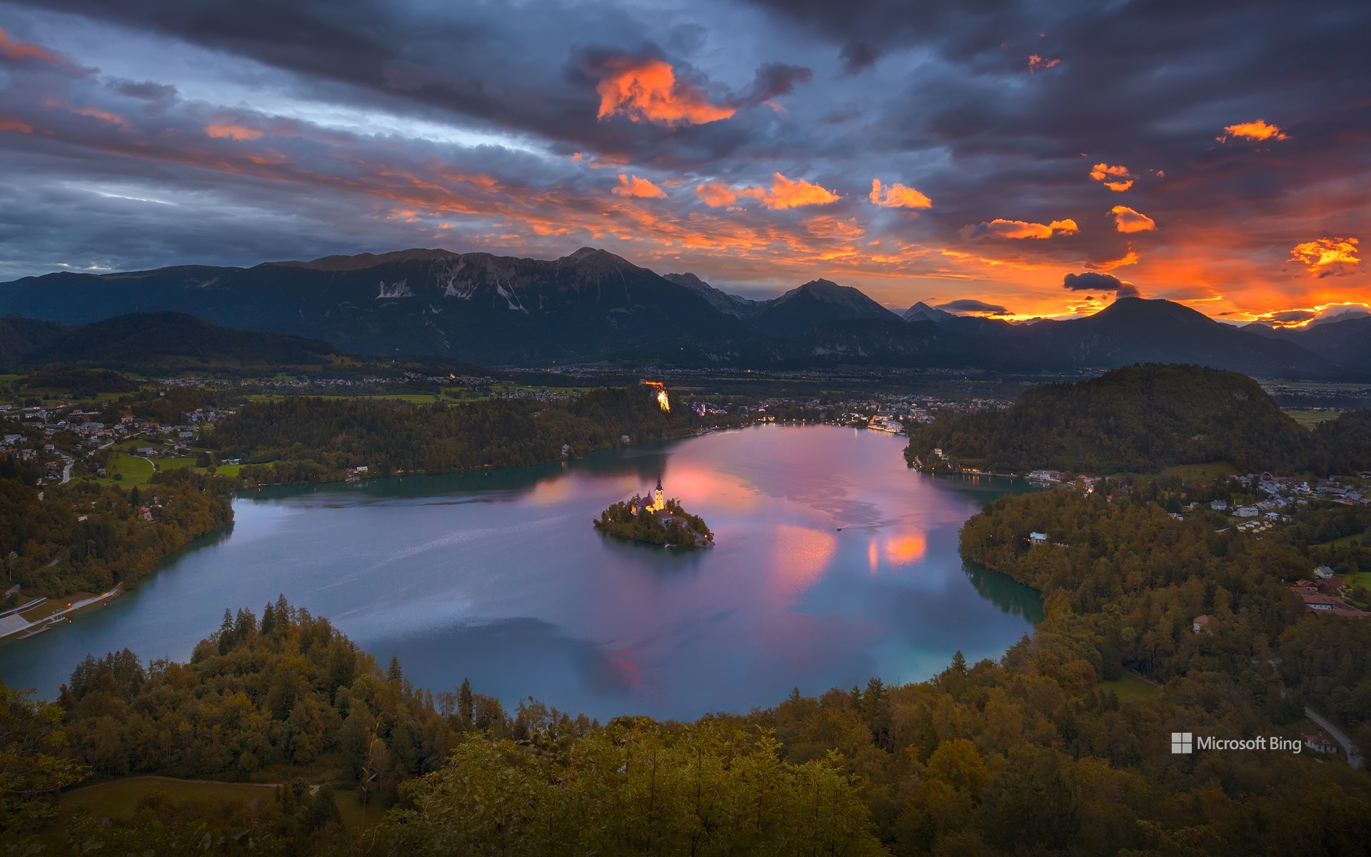 Lago Bled do ponto de vista de Osojnica ao nascer do sol, Eslovênia (© Rasica/Getty Images)