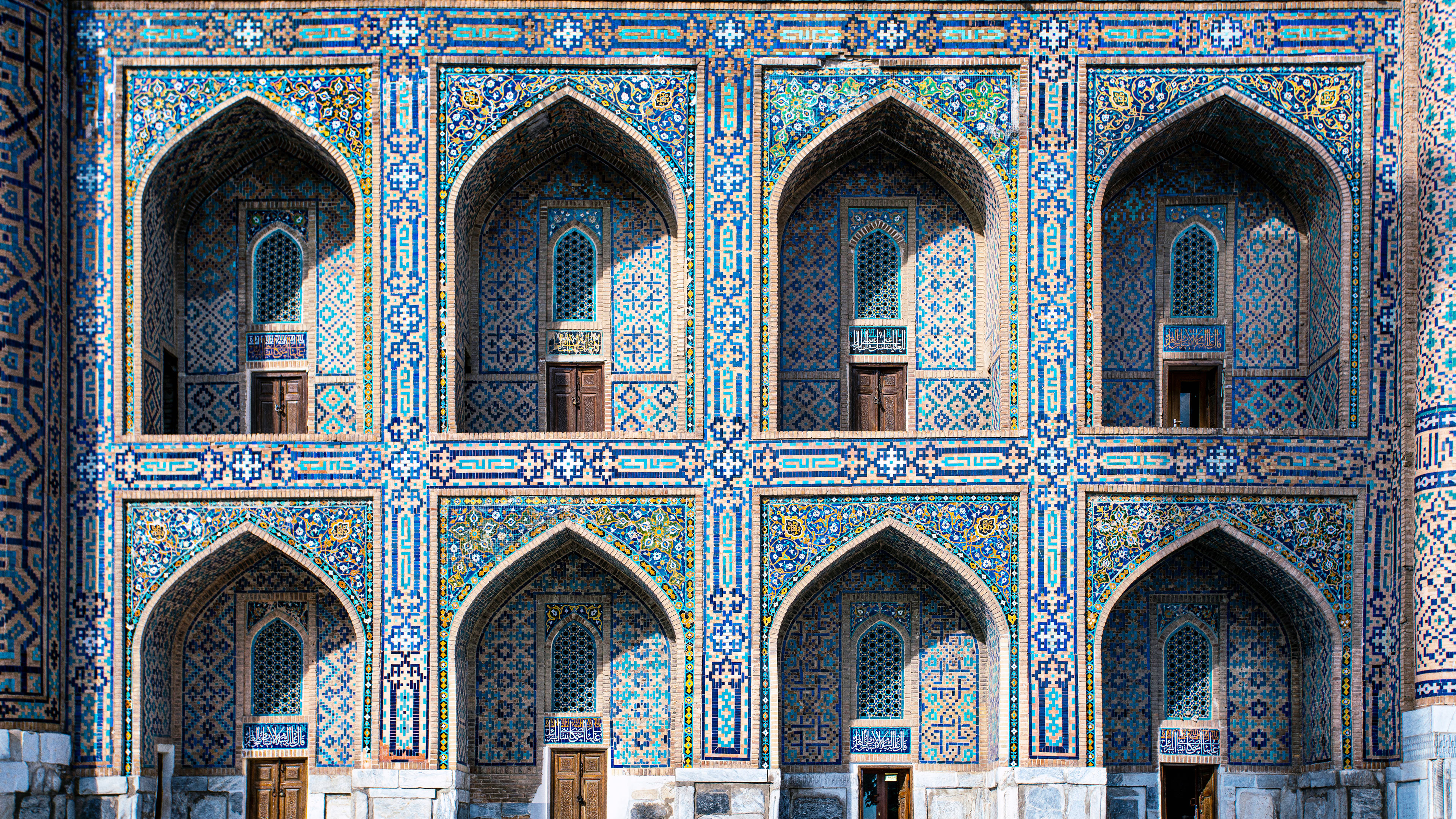 Fachada de mosaico na Praça Registan, Samarcanda, Uzbequistão (© da-kuk/Getty Images)