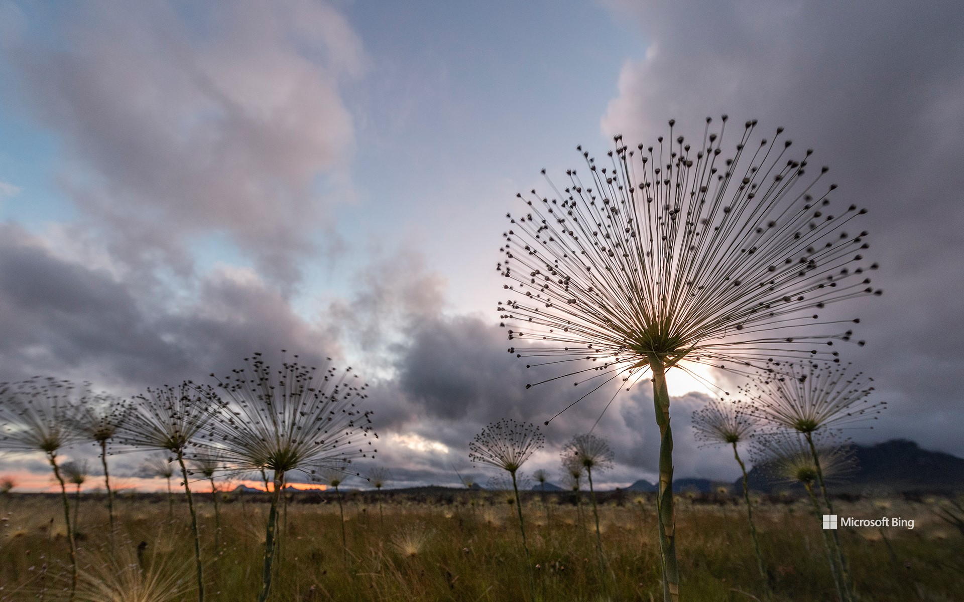 Na Chapada dos Veadeiros, em Goiás, nossa imagem captura um momento em que o sol ainda hesita, mas o cerrado já despertou. Do chão seco brotam centenas de chuveirinhos, plantas do gênero Paepalanthus que se erguem como fios de luz, coroados por uma esfera branca e delicada. O vale se ilumina entre essas plantas que nascem onde quase nada mais ousa crescer. Enfrentam solos pobres, clima rigoroso e queimadas frequentes.