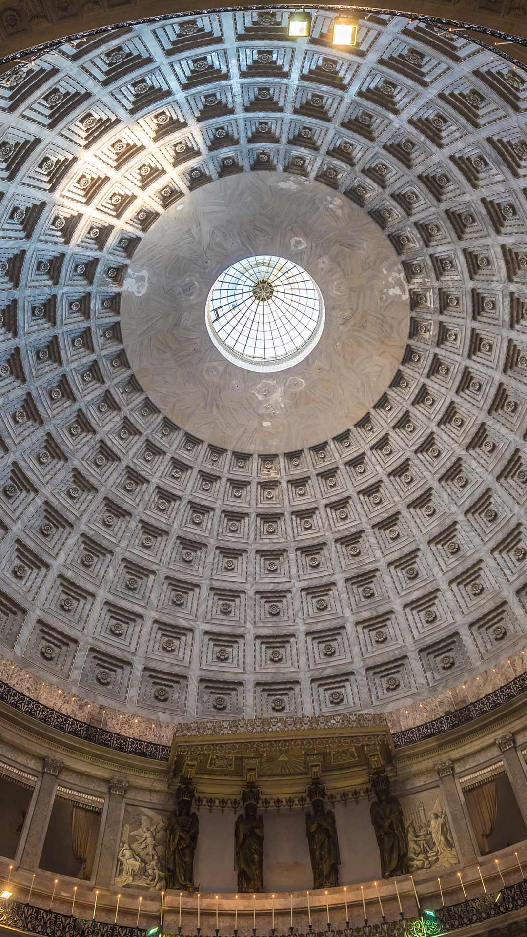 Concluída em 1846, a basílica segue princípios rigorosos do neoclassicismo: corpo circular, frontão triangular e uma cúpula inspirada no Panteão, famoso templo romano do século II. No interior, a harmonia geométrica continua com mármore polido, amplos arcos e capelas distribuídas ao longo do percurso circular. A praça é emoldurada por uma colunata curva que destaca a cúpula da basílica, criando um cenário majestoso e fotogênico.