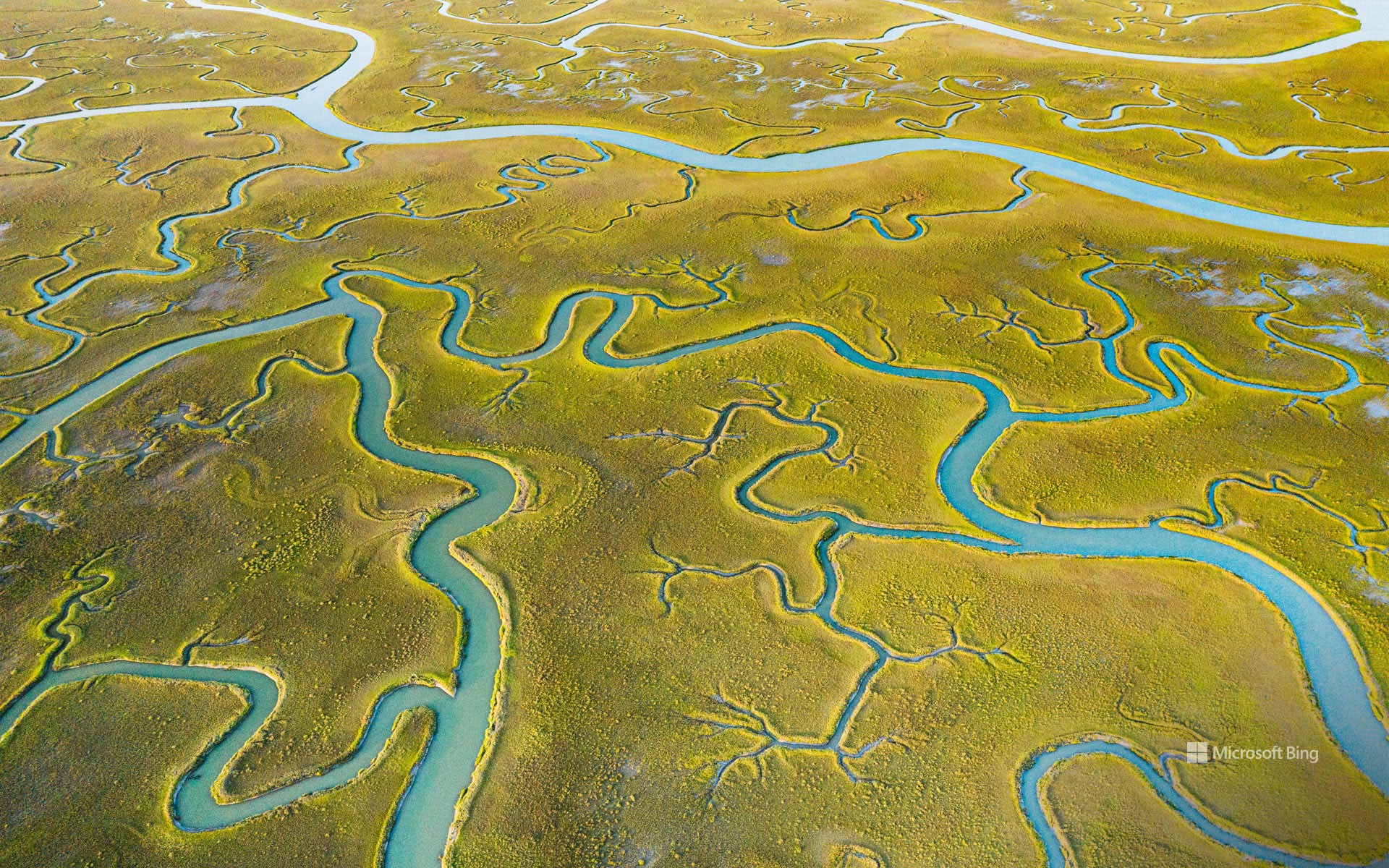 鸟瞰Mockhorn岛野生动植物管理区沼泽地内的潮汐通道,弗吉尼亚 (© Shane Gross/Minden Pictures)