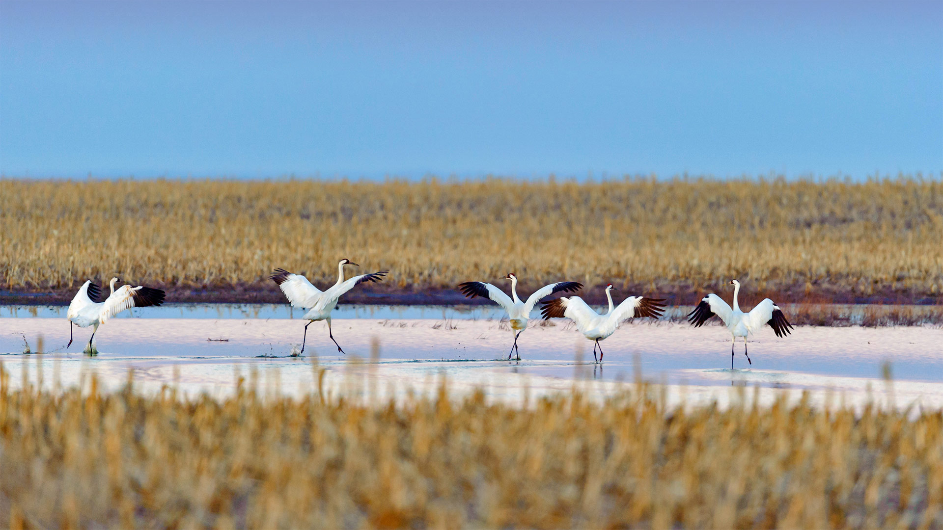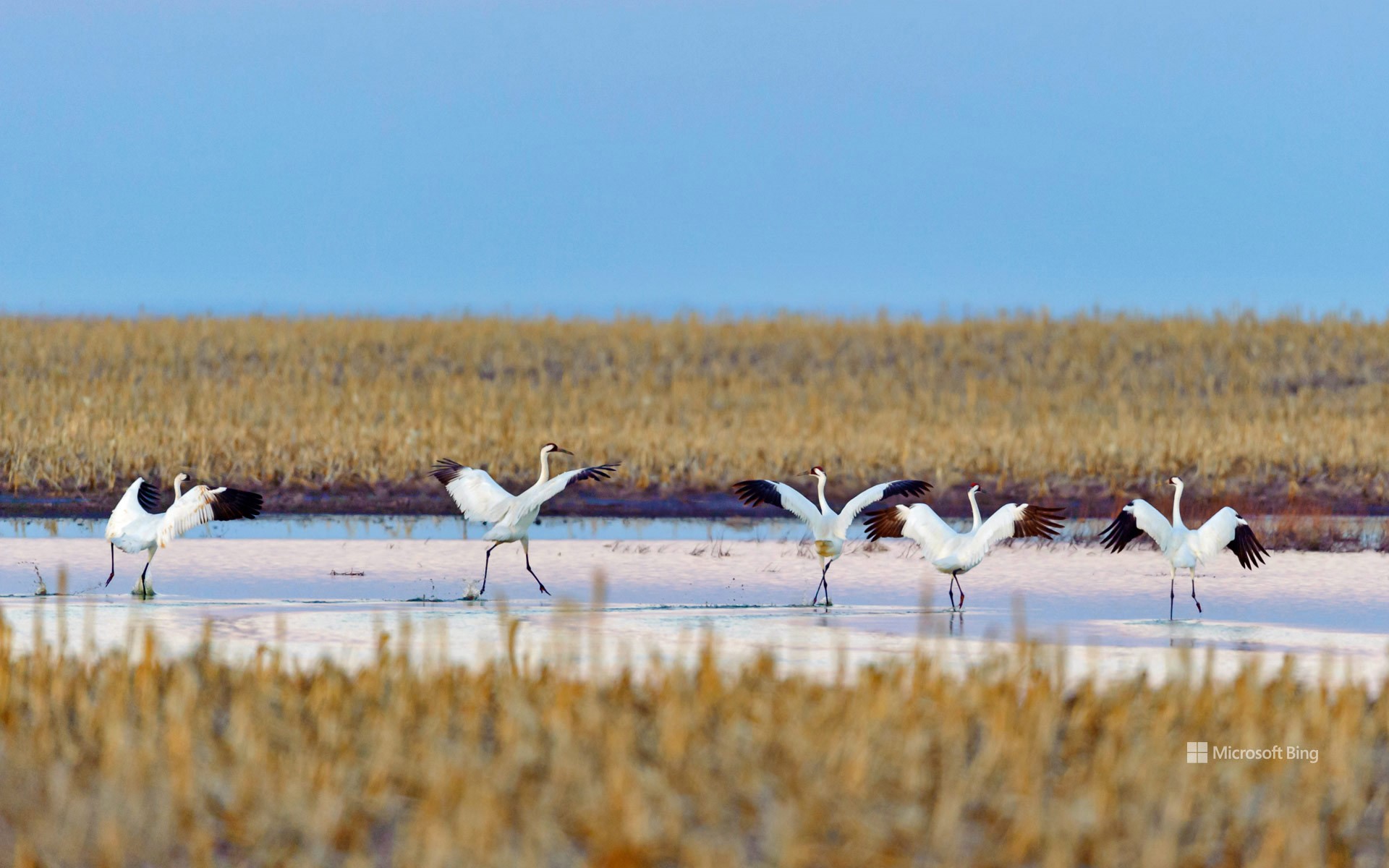 春季迁徙时正准备起飞的美洲鹤,南达科他州 (© Gerrit Vyn/Minden Pictures)