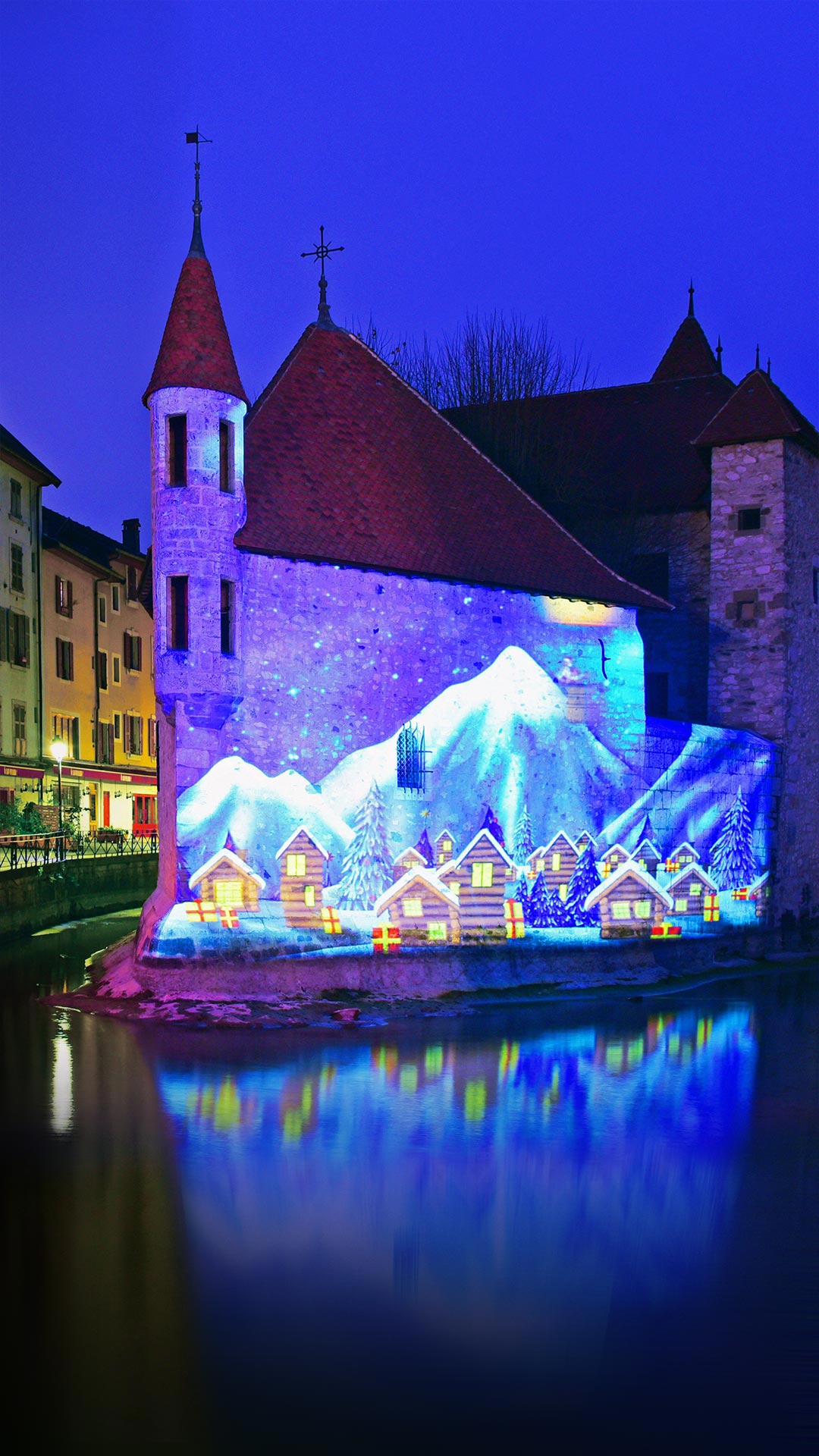投射在安纳西中皇岛墙上的雪景影像,法国上萨瓦省 (© blickwinkel/Alamy)