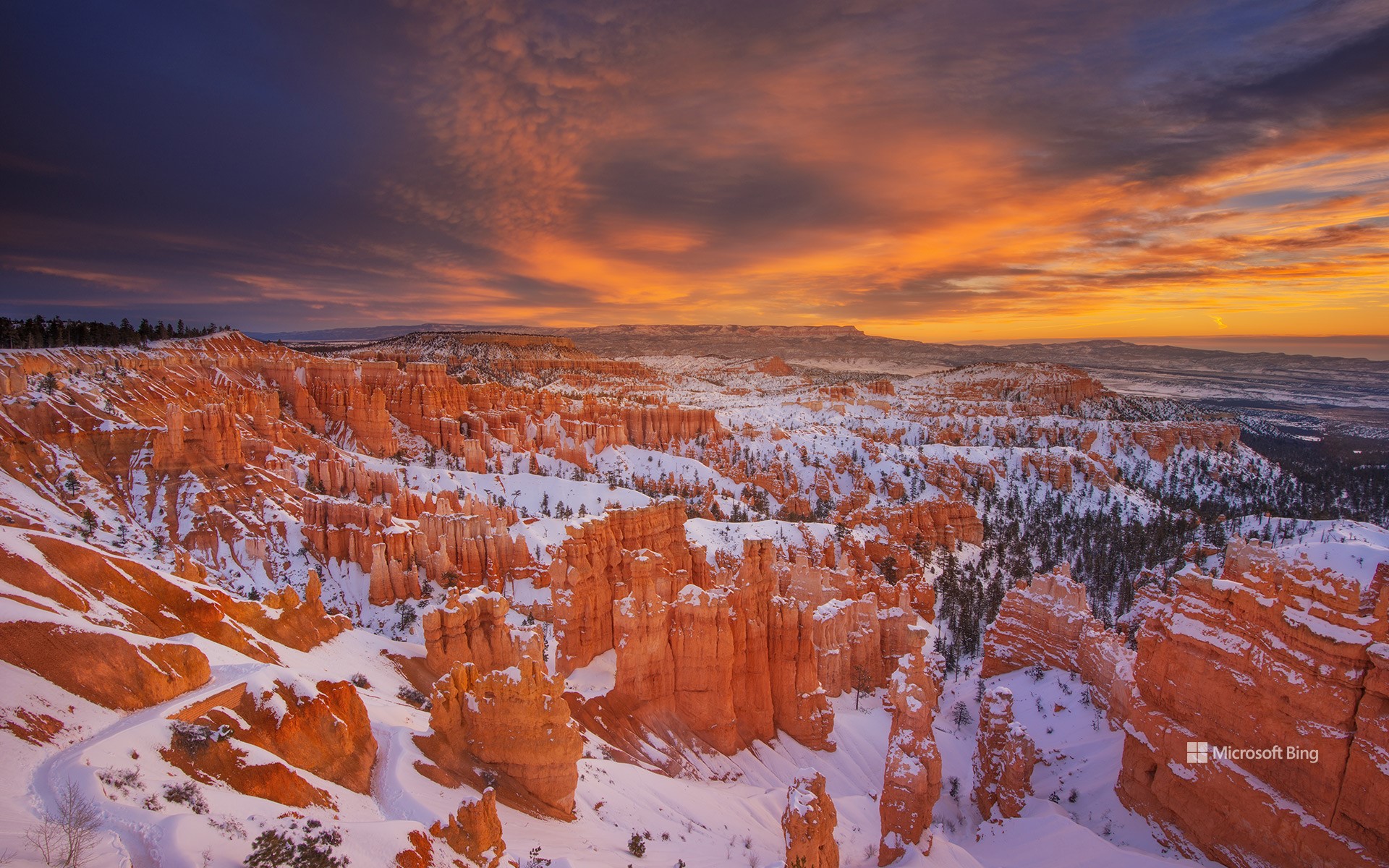 当太阳在布莱斯峡谷升起时,白雪皑皑的橙红色岩石闪闪发光。这些修长高耸的岩石被称为石林,而布莱斯峡谷国家公园正是因为拥有地球上密度最高的石林而闻名。这些石林的下层是松软的沉积岩,上面则覆盖着一层更为坚硬的石盖。犹他州冬天的冰霜会侵蚀石盖,最终暴露出底下更易被侵蚀的岩石。值得庆幸的是,这些石林现在还屹立不倒,让我们可以在公园成立100周年之时欣赏大自然的鬼斧神工。