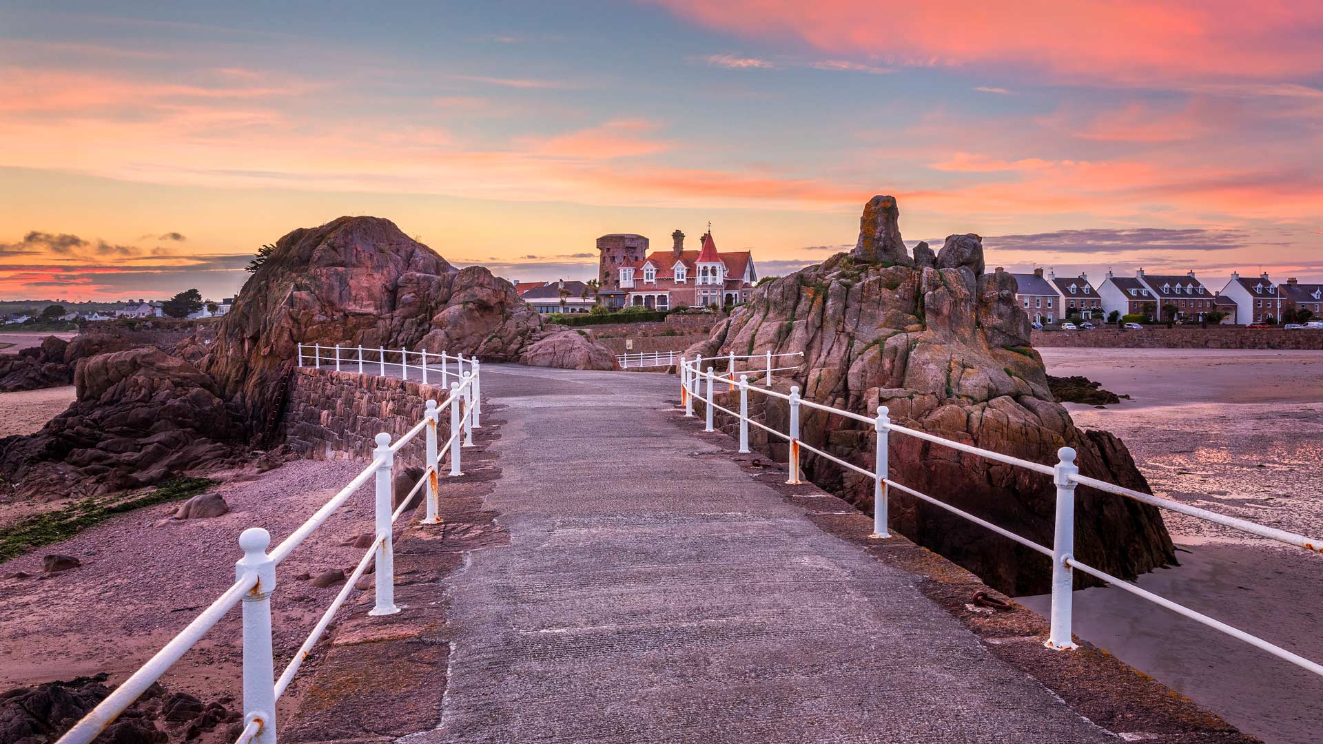 泽西岛位于法国诺曼底海岸附近,是一个有着北欧名字的英属岛屿。拉罗克港位于岛的东南岸,这里有洁白的沙滩和延伸至水中的高架人行道。海岸线上的花岗岩和深成岩起源于4.2亿多年前,呈现出多样化的颜色和纹理。从港口可以看到圆圆的、矮胖的伊乔塔和较高一些的西摩塔,它们分别建于18世纪和19世纪,是海防建筑。这两座建筑距离海岸都有1800多英尺,如果你想步行到这两座建筑的所在地,不仅需要穿一双结实的鞋子,还只能选在一年中潮水退至最低点的时候。