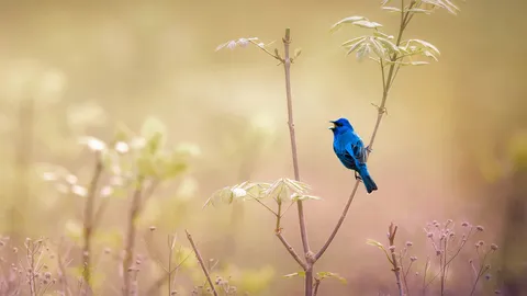 每年这个时候,从晚春到夏季,成年的雄性靛蓝彩鹀就会变成亮眼的深蓝色。它们飞上高枝——就像我们这个快乐的家伙飞到向日葵上面——从早到晚地唱歌,试图吸引雌鸟的注意。靛蓝彩鹀是红雀科“蓝色”分支(亚群)的一员。