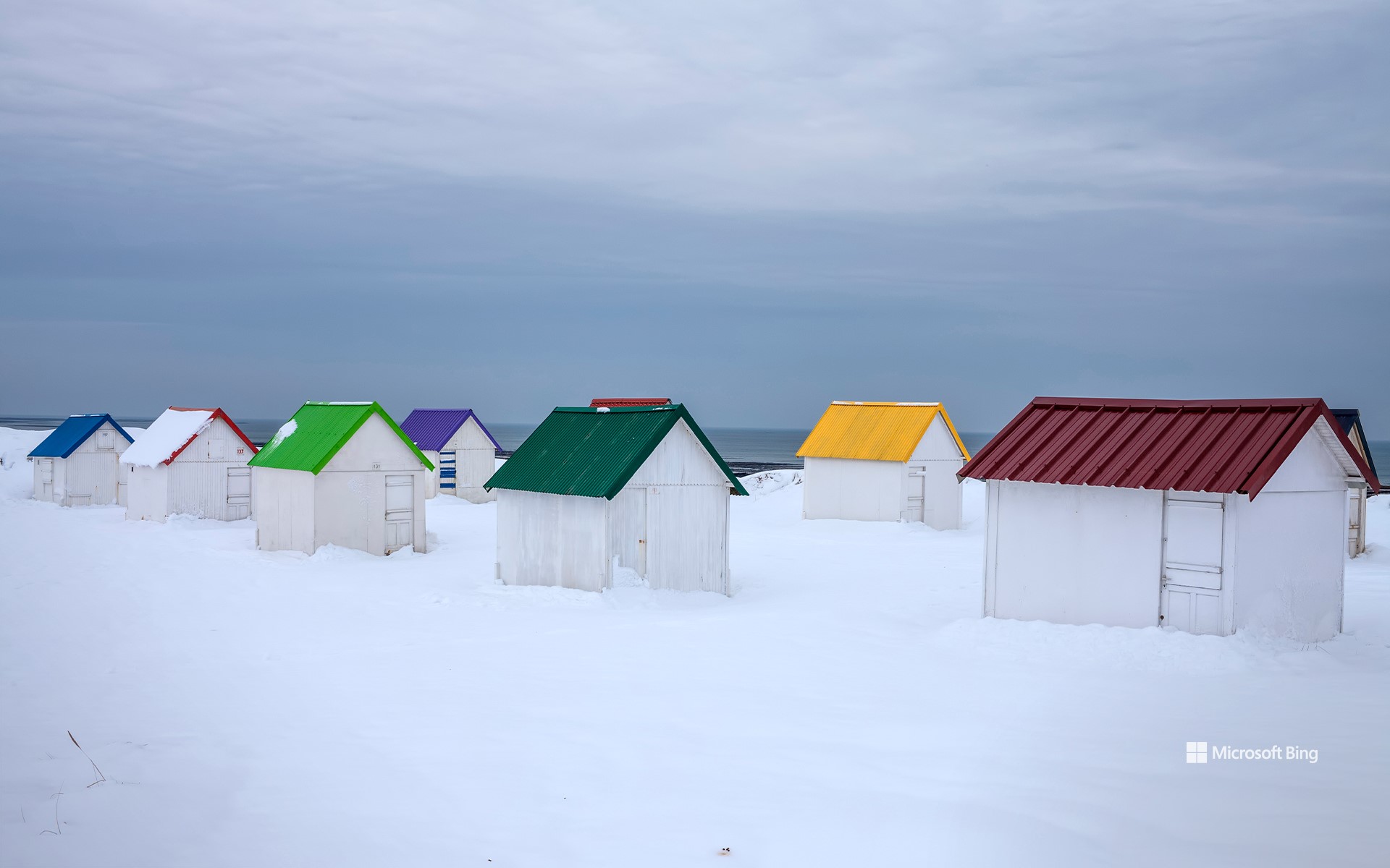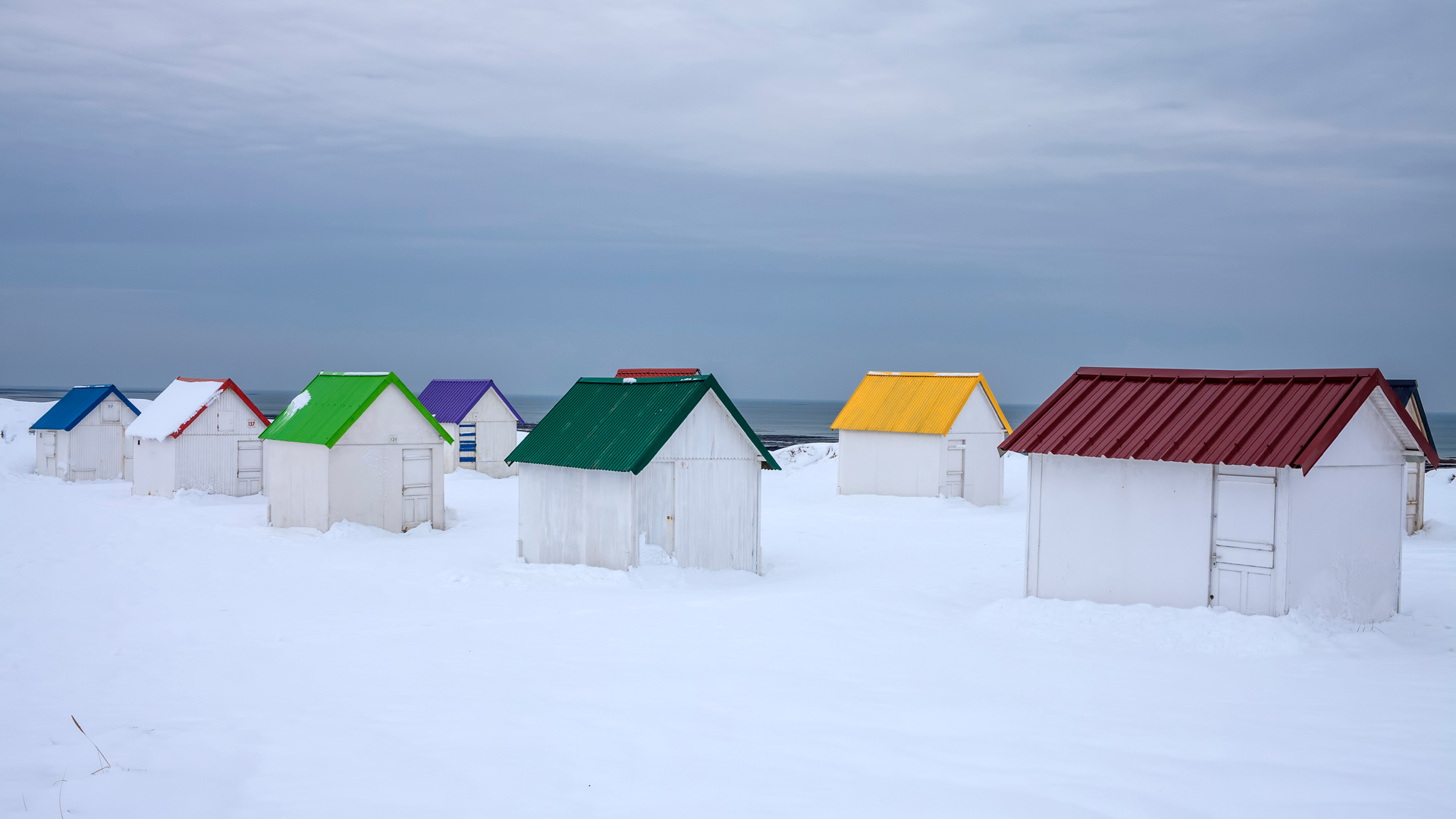 Cabanes aux toits colorés recouvertes de neige à Gouville-sur-Mer, Normandie (© Andia/Getty Images)