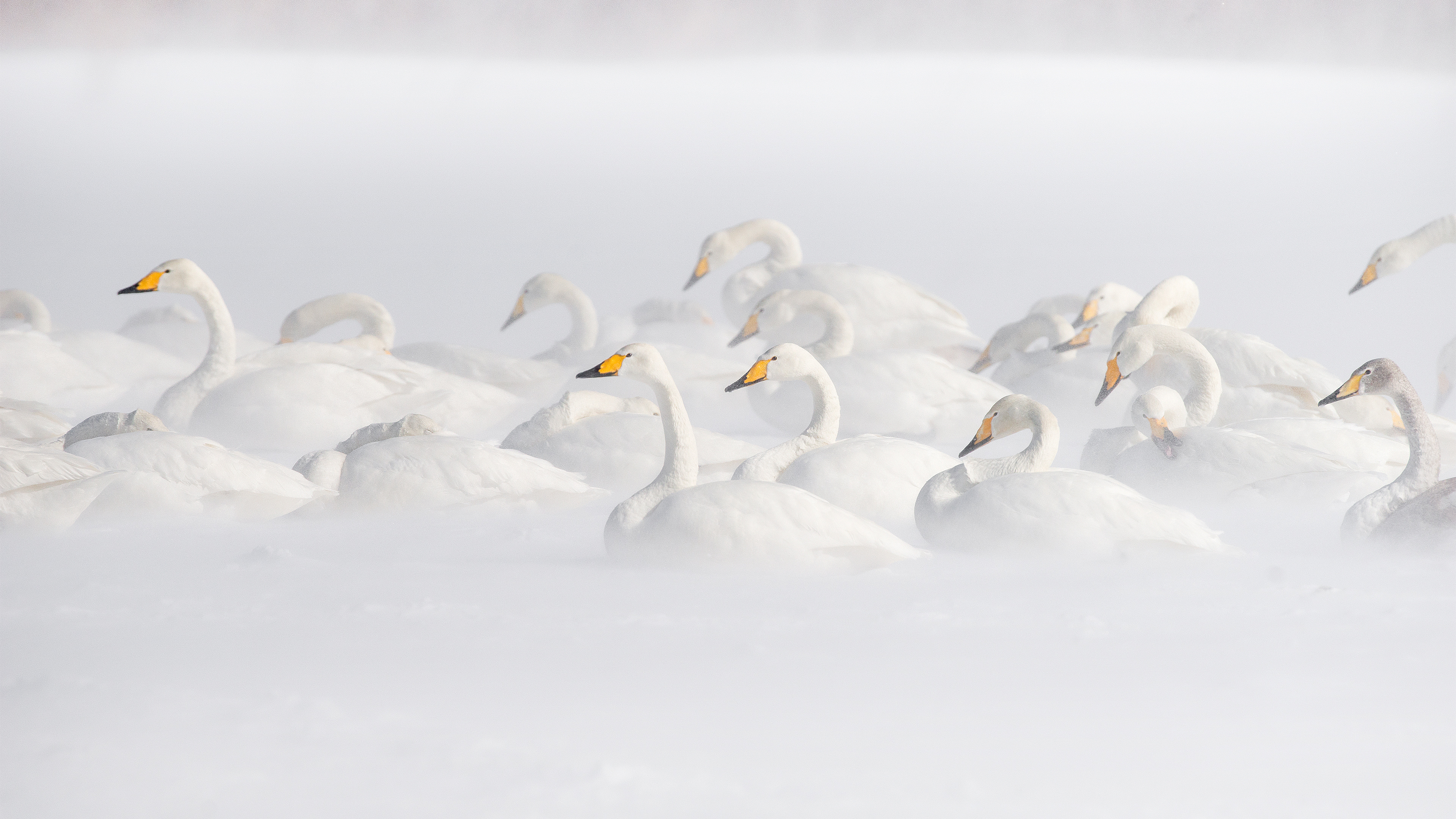 今日の画像は北海道・屈斜路湖に越冬のため訪れた、純白の羽と黒いくちばしが特徴のオオハクチョウの群れ。若鳥は淡い灰褐色ですが、成長とともに白くなります。体長は約 140cm、翼を広げると 2m を超えることもあり、長距離を飛翔する鳥としては最大級です。身体が重いため、離陸時には助走が必要です。